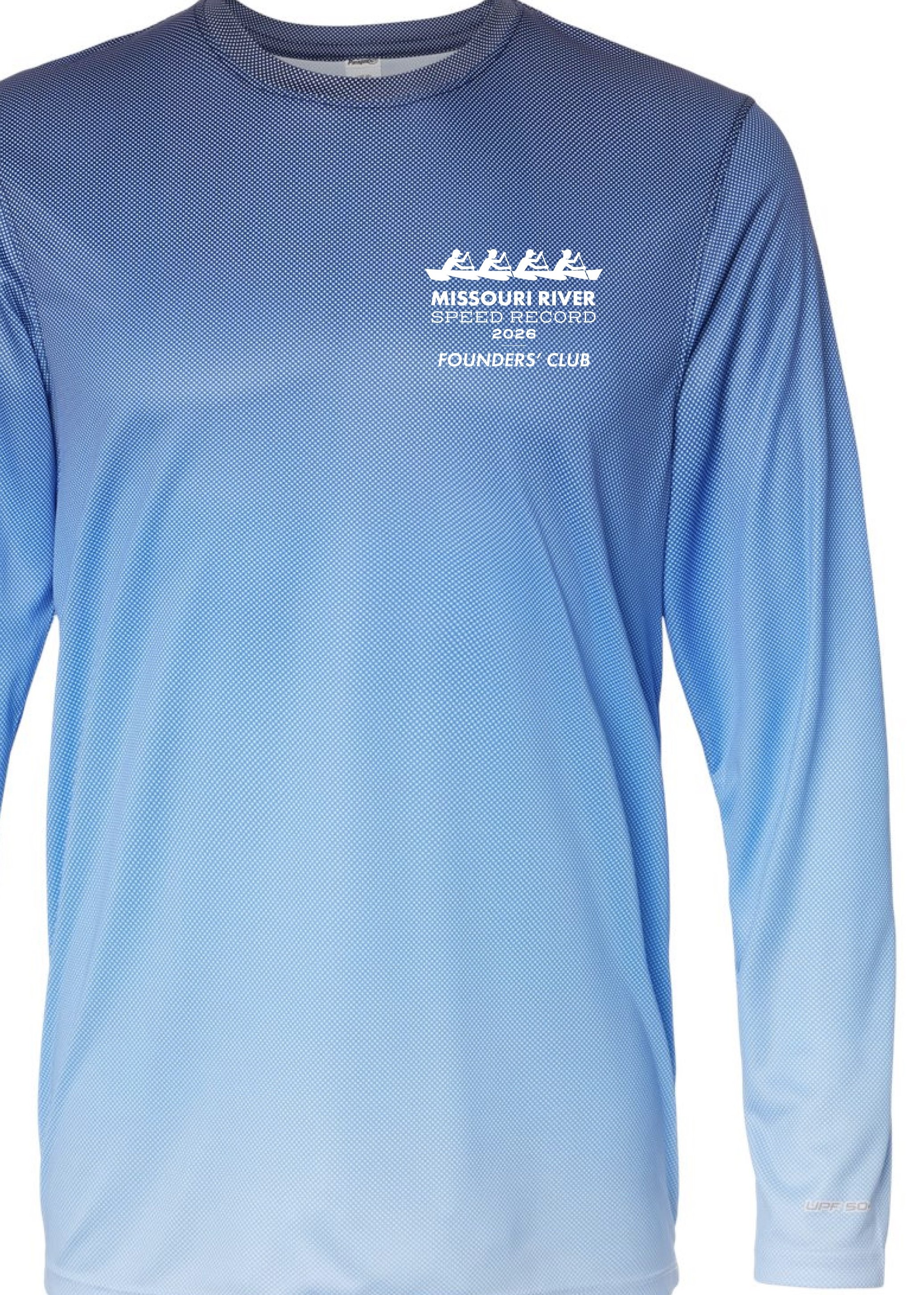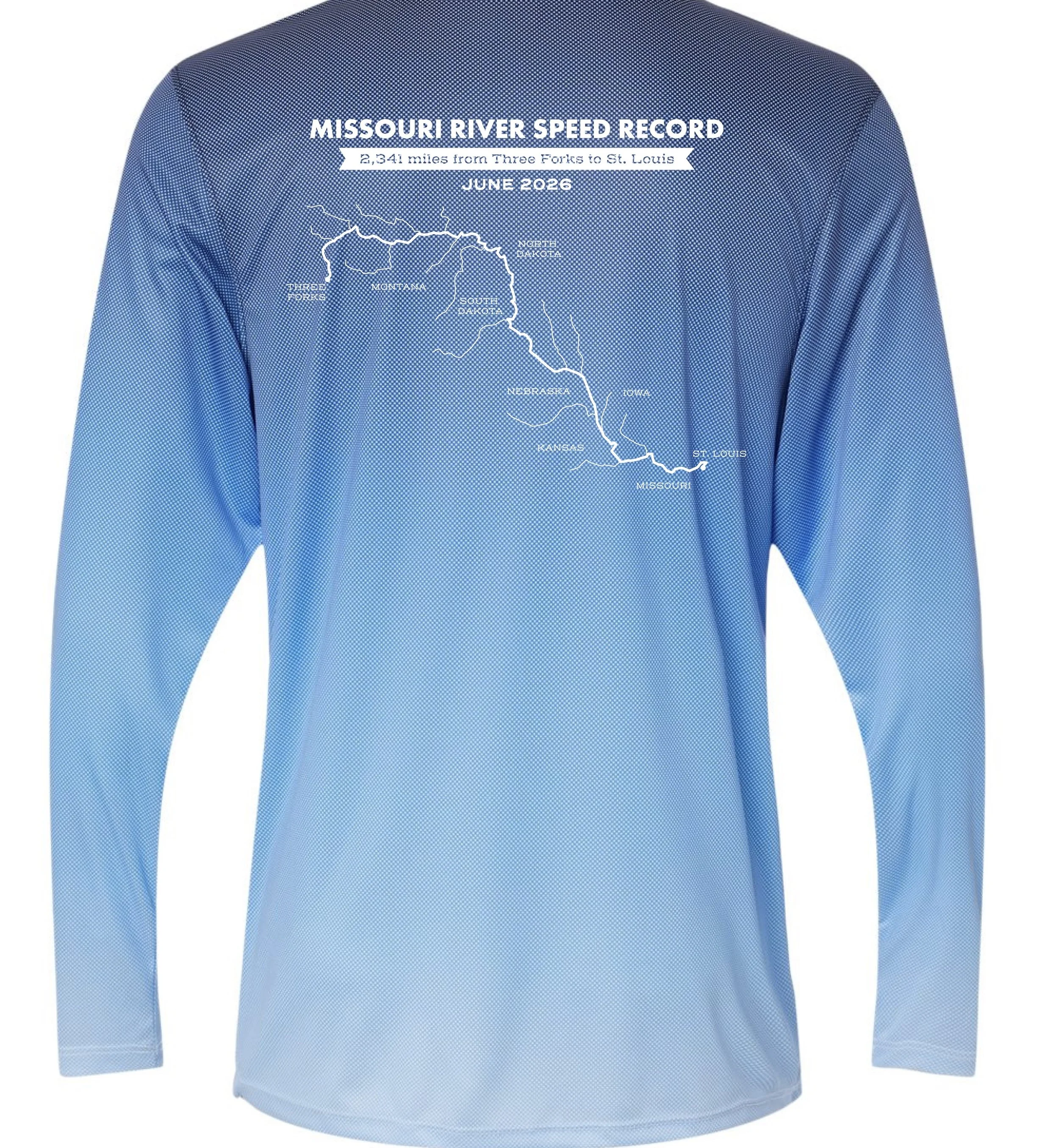 A custom long sleeve performance t-shirt with the Missouri River Speed Record logo on front and a map of the route on the back.